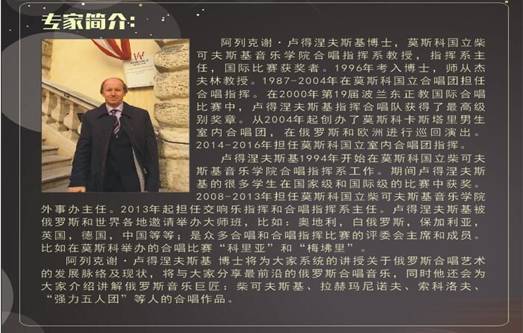 专家简介:阿列克谢·卢得涅夫斯基教授为莫斯科国立柴可夫斯基音乐学院合唱指挥系教授,交响乐指挥和合唱指挥系主任,国际比赛获奖者。他在教学、表演、科研领域拥有丰富的成绩,经常在俄罗斯和欧洲的各个音乐学院举办讲座交流,并进行合唱表演方面的活动。卢得涅夫斯基被俄罗斯和世界各地邀请举办大师班,如:奥地利,白俄罗斯,保加利亚,英国,德国,中国等等,是各种合唱和合唱指挥比赛的评委会主席和成员。