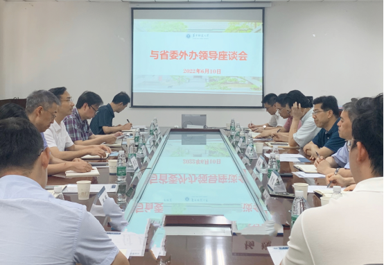 我校国际合作与交流处、国际文化交流学院、政治与国际关系学院等单位相关负责人分别汇报了我校对外交流合作、留学生工作及智库建设等方面情况,并与省委外办政策研究处、外国机构服务中心、出国来华管理处,友协秘书处负责人就相关工作进行了深入交流。