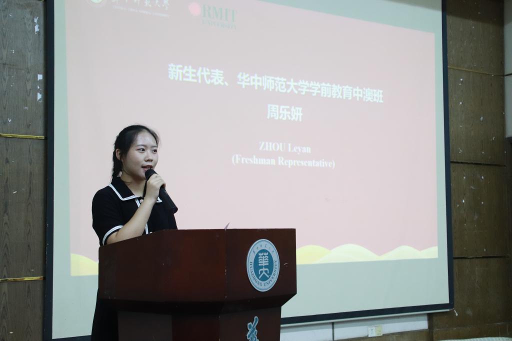 学前教育中外合作办学项目2019级周乐妍作为新生代表上台发言,她表达了经过多年学习进入桂子山求学的不易,也展望了未来的大学生活,希望能够通过自身的奋斗谱写精彩的人生华章。