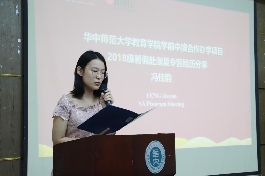 2019年暑期,我院副院长申国昌、本科生辅导员张萌、学前教育系教师刘丽伟和AEMG教师魏雪带领15名2018级学生赴澳开展为期14天的交流学习活动。在播放完此次交流学习活动的视频后,学前教育中外合作办学项目2018级在校生冯佳韵,作为2019年暑期赴澳交流学生代表上台发言,她简单介绍了这次暑假赴澳交流历程,描述了当地的风土人情和文化特色,分享了此次交流的感想。