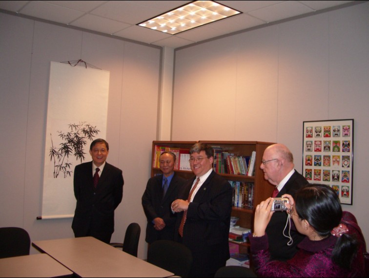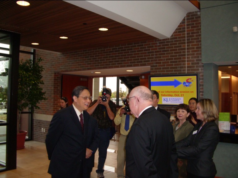 周文重大使在中国驻芝加哥总领事徐尽忠的陪同下,抵达位于堪萨斯城爱德华兹校区的我校与堪萨斯大学合办的孔子学院,和早已在此等候的堪萨斯大学校长罗伯特·海明威热情握手,亲切交谈。周文重大使和徐尽忠总领事在海明威校长和孔子学院执行院长比尔·楚促宜的陪同下,饶有兴趣地参观了孔子学院的专用教室、资料室和办公区。周大使认真听取了梁志群、易宏根两位老师所作的学院开办及教学情况的介绍,观看了汉语远程教育项目的录像短片。周大使感谢美方在孔子学院的建设中给予的支持和帮助,高度肯定了我校与堪萨斯大学合办孔子学院的工作成绩,勉励全体教师、工作人员为推广汉语教学、弘扬中华文化做出贡献。