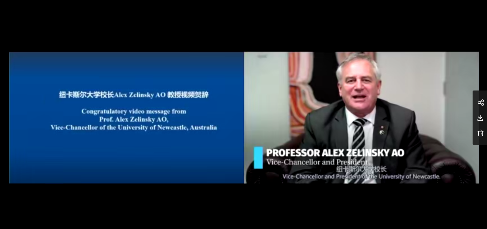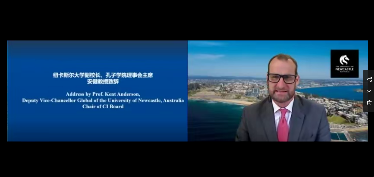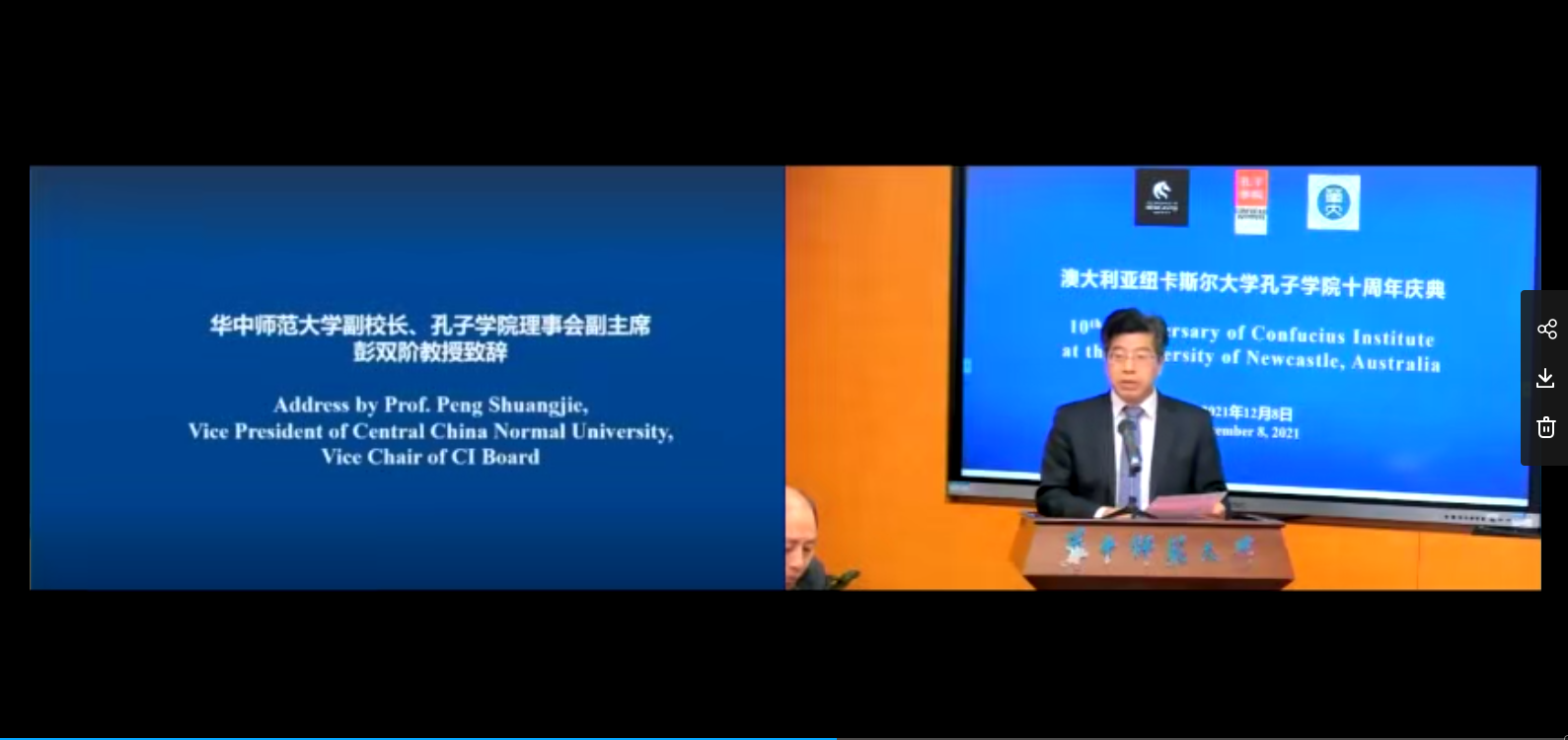 12月8日,我校与澳大利亚纽卡斯尔大学在线上联合举办孔子学院十周年庆典。中国驻悉尼总领事周立民、校长郝芳华、纽卡斯尔大学校长阿列克斯·泽林斯基(Alex Zelinsky)通过视频向纽卡斯尔大学孔子学院十周年庆典表示祝贺。中国国际中文教育基金会副理事长兼秘书长赵灵山,纽卡斯尔大学副校长、孔子学院理事会主席安健(Kent Anderson),副校长、孔子学院理事会副主席彭双阶致辞。