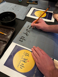 书法体验区则展示了中国书法艺术的优雅与深邃。学生们在孔院国际中文教育志愿者的帮助下,学习了如何握笔、如何运笔,以及如何书写中秋节等汉字。书法不仅是文字的书写,更是一种艺术的表达,它让学生们在一笔一划中感受到了中国文字的美感和哲学。