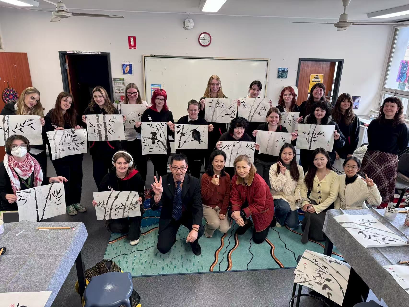 8月18日至19日,孔院教师团队先后在Cooks Hill School、Novoschool和纽卡斯尔大学开展中国水墨画教学活动。华中师范大学美术学院李果教授以“竹”为主题,逐步演示中国写意画的笔墨技法,杨畅院长现场翻译,确保文化理解的准确性,学生们在教师指导下完成了一幅幅各具特色的水墨作品,感受到中国画“以形写神”的审美意蕴。