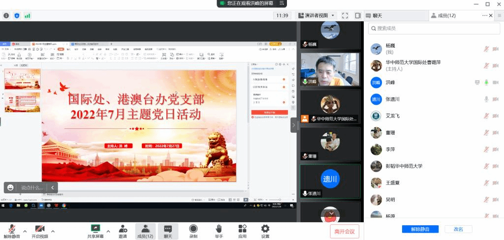 应学校党委要求,7月28日上午9时,国际处党支部全体13名在职在岗党员通过腾讯会议在线举办了一场特殊的主题党日活动。尽管大家身处异地,都如约守候在云端认真学习思考,保质保量地完成了学习任务。