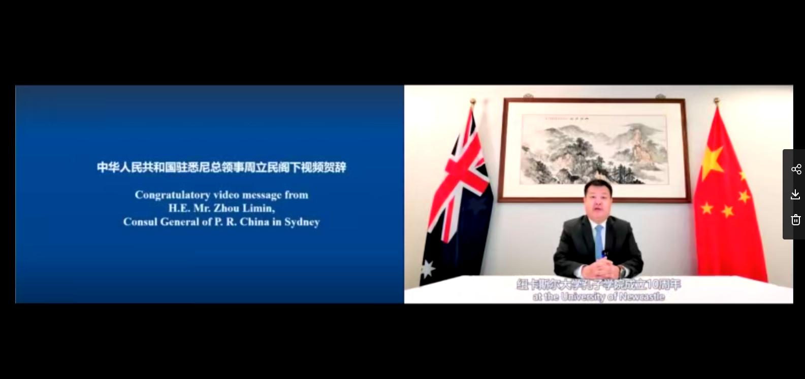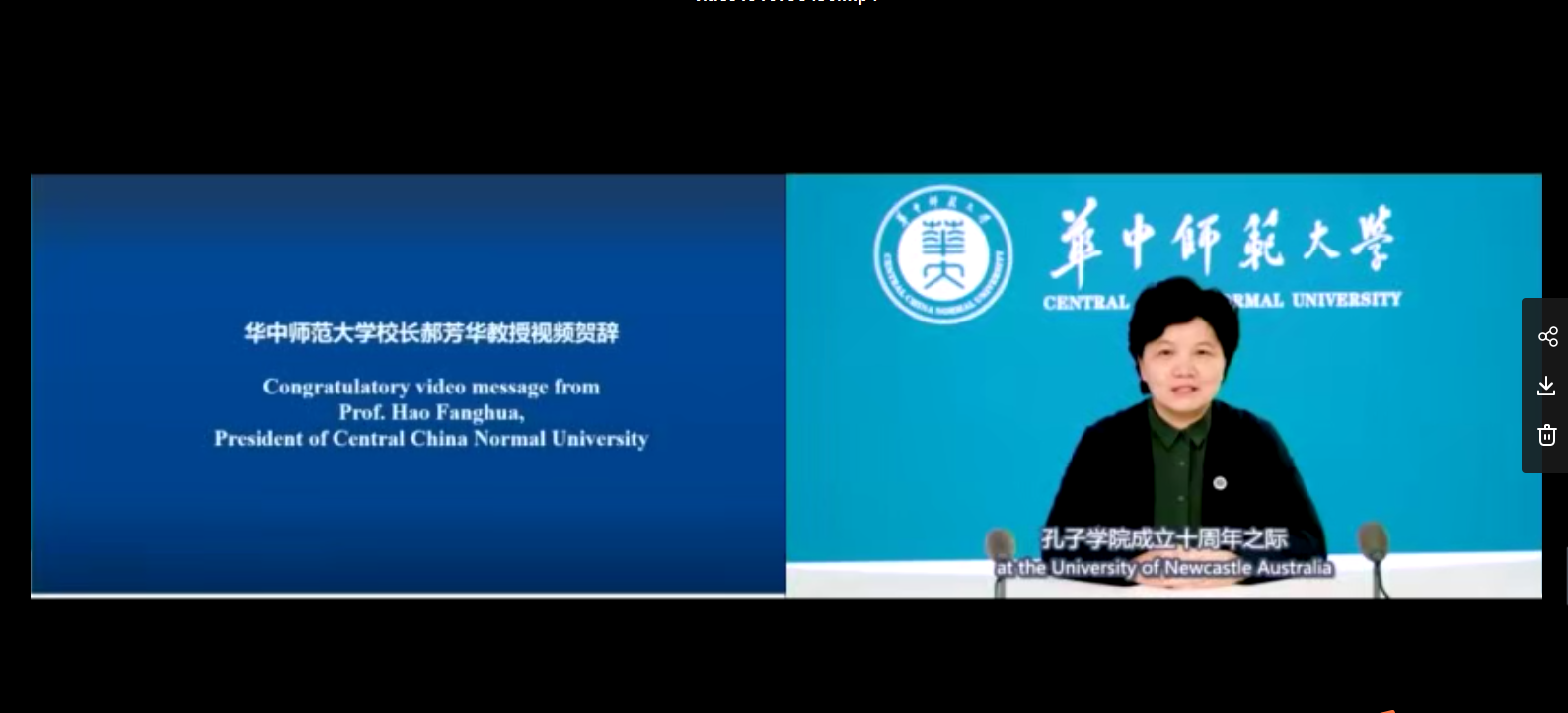 12月8日,我校与澳大利亚纽卡斯尔大学在线上联合举办孔子学院十周年庆典。中国驻悉尼总领事周立民、校长郝芳华、纽卡斯尔大学校长阿列克斯·泽林斯基(Alex Zelinsky)通过视频向纽卡斯尔大学孔子学院十周年庆典表示祝贺。中国国际中文教育基金会副理事长兼秘书长赵灵山,纽卡斯尔大学副校长、孔子学院理事会主席安健(Kent Anderson),副校长、孔子学院理事会副主席彭双阶致辞。