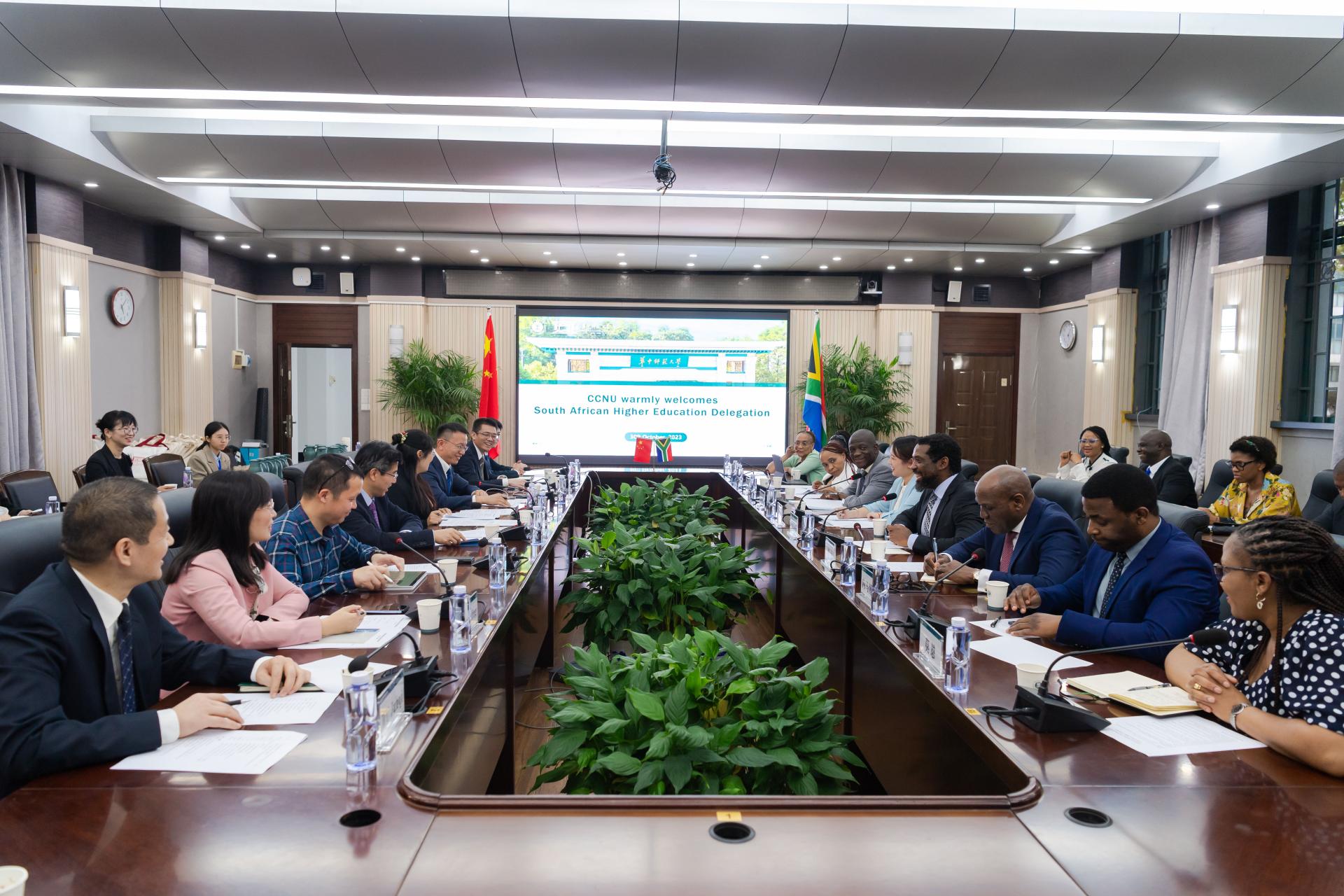 彭双阶对南非高等教育代表团的到访表示欢迎。他介绍了学校的历史沿革与办学发展情况,特别是我校在信息技术与教育的深度融合方面取得的突出成就。他表示,学校始终坚持开放化办学,积极构建面向全球的国际合作伙伴关系网络,为促进中外人文交流做出了积极贡献。学校积极响应“一带一路”倡议,多年来持续招收南非等国留学生,并在中国驻南非大使馆和南非基础教育部的大力支持下,于2022年承办了南非中小学骨干教师能力建设高级培训班,面向南非中小学优秀数学教师和基础教育部学科顾问、教学专家及官员等学员开展专业培训,收获广泛好评。期待双方以本次来访交流为契机,在共建“一带一路”倡议提出十周年之际,能够进一步深入交流,在国际中文教育、人才培养、学术交流等方面开展务实合作。