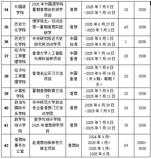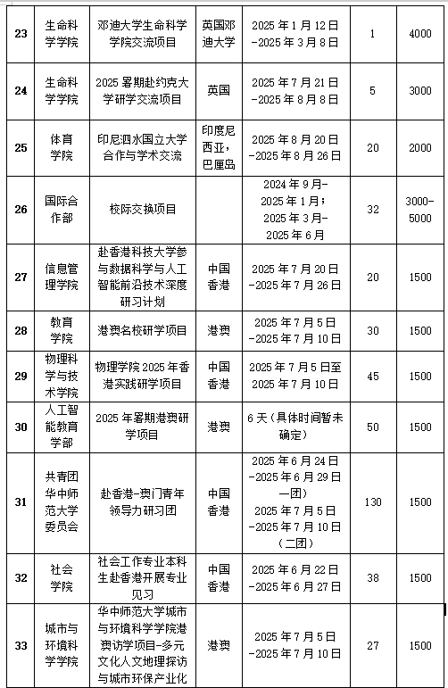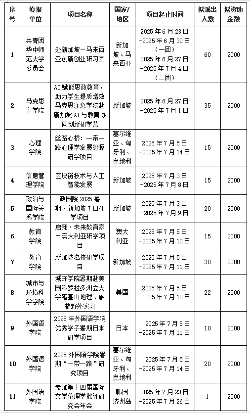 根据我校关于开展2025年海外学习交流项目申报工作的通知及华中师范大学学生海外学习交流助学金资助细则(2025年版)相关精神,经各单位申报,相关职能部门评审,拟同意共青团华中师范大学委员会2025年赴新加坡-马来西亚创新创业研习团等42个海外学习交流项目立项。现将具体名单公示如下: