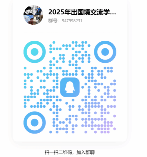 请获批立项的项目负责人与联络人扫描下方二维码加入2025年出国境学习交流项目联络群,完成后续平台立项及项目完善工作。项目实施后两个月内向国际合作部、港澳台事务办公室提交结项报告。
